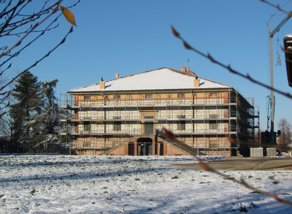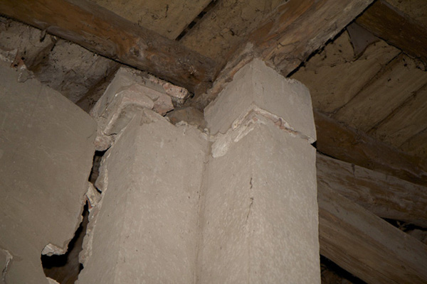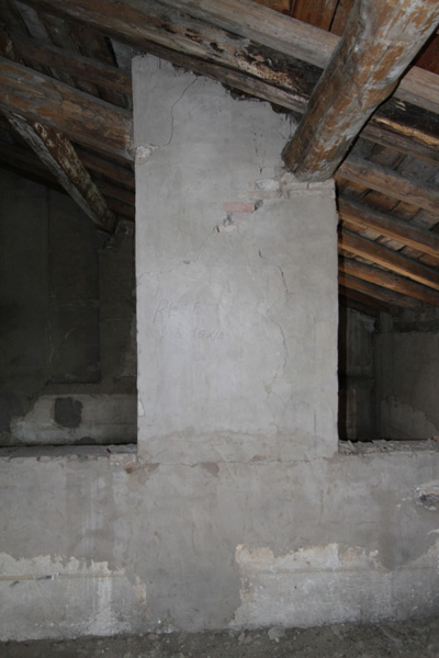 Il piano sottotetto presenta una struttura a travi e pilastri a sostegno del colmo e dei cantonali, con una muratura continua perimetrale realizzata con cortine posate di testa, slegate tra loro, ossia prive di elementi trasversali di ammorsamento (diatoni). Per stabilire il quadro fessurativo dell’insieme e ripristinare la continuità strutturale, si dapprima rimosso l’intonaco lesionato sino al vivo della struttura, previa una campagna di indagini stratigrafiche per scongiurare la presenza di superfici affrescate, e si sono poi poste in opera reti in fibra di vetro con malte idonee ad alta resistenza meccanica. La finitura superficiale è stata realizzata con una stesura di intonaco a grassello di calce.