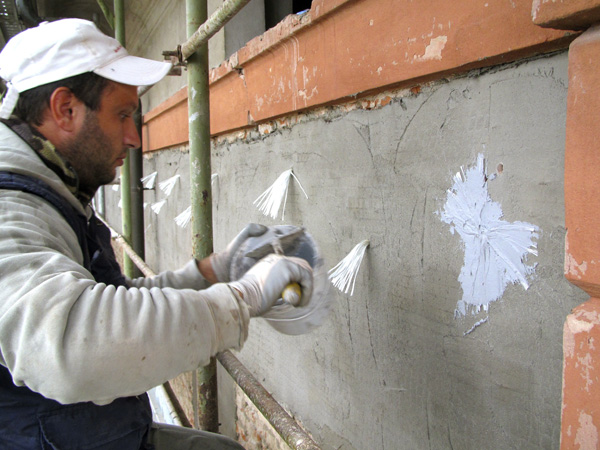 Per ricostruire la continuità della facciata si è ricorso a una fasciatura completa dell’edificio all’altezza del solaio del sottottetto con rete in fibra di vetro, così da realizzare un anello di contenimento della spinta delle travi. Queste sono poi state legate tra loro CITA in modo da realizzare un solaio rigido.