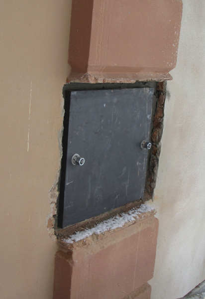 La piastra terminale di una doppia catena che lega la cortina trasversale alla facciata. Vista dall’interno.
