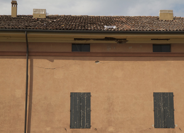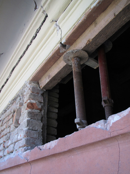 L’oscillazione prodotta dal sisma ha fatto sì che le travi del solaio del sottotetto ‘punzonassero’ le facciate, aprendo lunghe fessurazioni orizzontali nelle stesse sotto la fascia marcapiano.