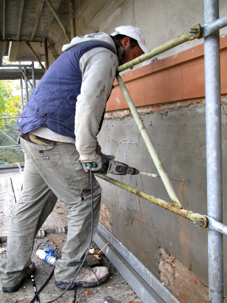 La muratura sovrastante la quota dei pilastri dell’originaria barchessa CITA è risultata costituita da due pannelli tra loro slegati. Per renderli solidali e aumentare la resistenza della struttura, i due pannelli sono stati legati tra loro con ‘fiocchi’ in fibra di vetro che si aprono a fiore sulle loro faccie esterne.