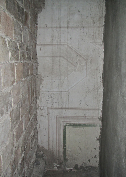 I vani formati dalla gola che illumina il bagno sono invece privi di decorazione. Su una delle pareti (foto 12) compare però una firma con data: Fantoni Rottilio 1880 (o 1884?). Negli anni ’30 del secolo scorso un Fantoni era capomastro della Tenuta Sessa; l’autore della firma potrebbe dunque esserne il padre o il nonno. La scritta conferma definitivamente che le gole di lupo e i controsoffitti sono stati realizzati dai Sessa negli anni ’80 dell’800, subito dopo il loro acquisto della tenuta nel 1878.