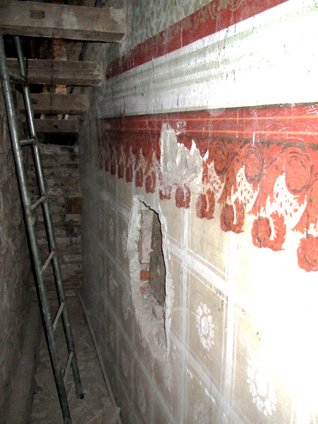 La zona più interessante (foto 7-10) è il vano formato dalla gola all’estremità est del corridoio (foto 6), in cui è apparsa (foto 8) nella sua completezza la decorazione precedentemente rinvenuta nel solaio in corrispondenza di quello stesso locale (foto 8 e 9).