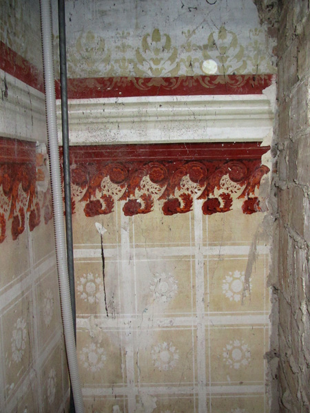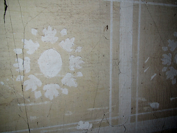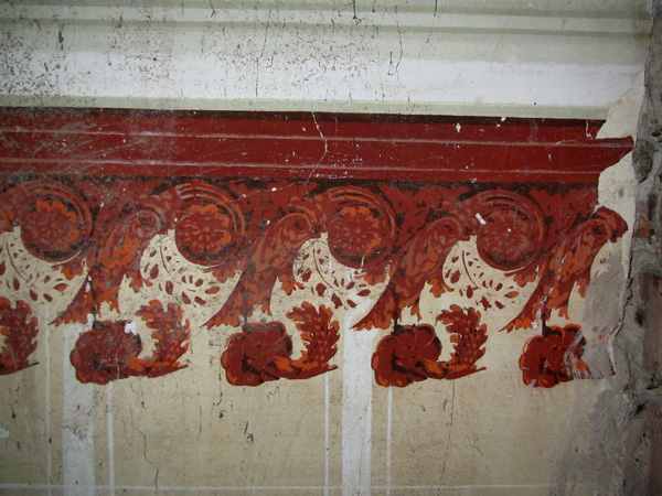 La seconda ragione è stata la necessità di rimuovere i controsoffitti in arelle, gravemente fratturati e in parte staccati a seguito della scossa sismica (foto 1). Rimosse le arelle (foto 2), nello spazio tra controsoffitto e soffitto sono apparsi in tutte le stanze dei lacerti di decorazione pittorica, diversa da stanza a stanza. In tutte, escluso l’attuale salotto, la decorazione era tone sur tone, quasi monocroma, a caratterete geometrico: losanghe e greche e svastiche intrecciate. Solo in salotto è apparsa una fascia policroma a cornucopie (foto 3-4).