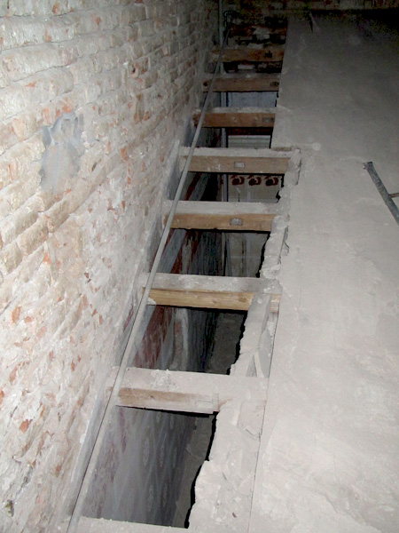Foto 6 – Vista dall’alto de vano formato all’estremità est del corridioio dalla tramezza che delimita la gola di lupo della finestra posta sotto il tavolato alla destra della foto