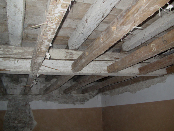 Foto 2 – Il controsoffitto dopo la rimozione delle arelle: in primo piano gli arcarecci che le sostenevano, in secondo i travetti e le travi del solaio.