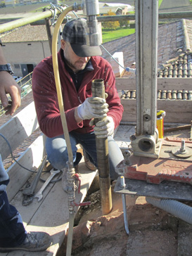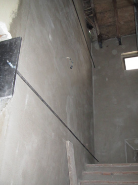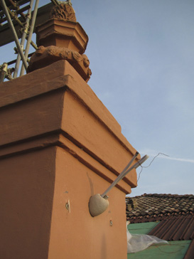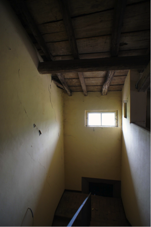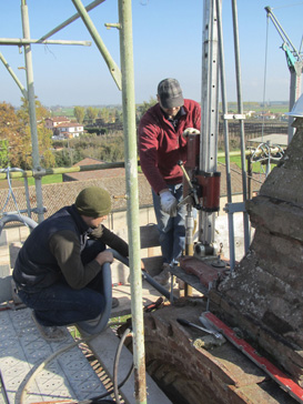 La tendenza della torre a inclinare verso l’interno non è dovuta solo al sisma, ma è favorita da un errata progettazione del muro di facciata e del raccordo tra questo e i due muri di spina; errore che ha provocato l’apertura di due ampie fratture in questi ultimi (foto 10 e 11). Le fratture sono state prima ricucite con rete in fibra di vetro, previa stonacatura delle pareti interessate, e poi legate con catene in ferro.