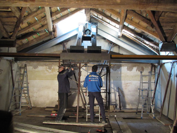 Foto 7 – La struttura reggi-spinta nel sottotetto: la parete in fondo è la faccia interna della vela campanaria. Si noti l’arco che la sorregge.