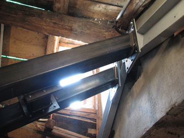 1) Per bloccare un’ulteriore torsione della torre sull’asse verticale, ogni pilastro è stato imperniarono con una barra d’acciaio di 6 cm di diametro, lunga 10 m, che va a incastrarsi sotto l’orologio nel muro di facciata (linee A blu foto 6a e b).