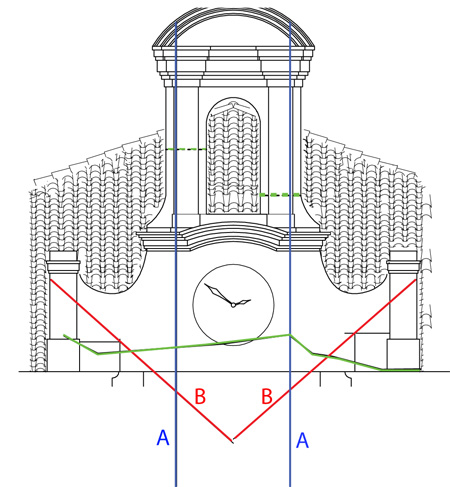 Foto 6a – Schema di inserimento delle barre d’acciaio nella torre campanaria a vela: vista frontale. Si notino le barre d’acciao che imperniano i due pilastri (linee blu) e quelle (linee rosse) che impediscono l’allargamento della frattura frontale (linea verde).