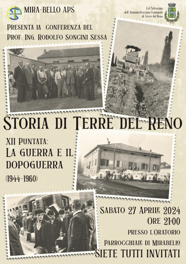 La dodicesima conferenza sulla Storia di Terre del Reno, organizzata dal Museo di Mirabello, dal Centro di Promozione Sociale di Mira-bello e dal G.T.C. di Mirabello, si è tenuta il 27 aprile 2024 presso l’Oratorio parrocchiale di Mirabello.