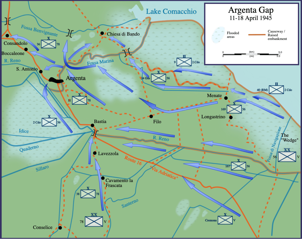 Tra il 12 e il 19 aprile l’8a Armata Britannica, appoggiata da un’intensissima azione dell’aviazione, riuscì a forzare il passaggio. Quando la 56a e 78a Divisione si trovarono libere di procedere verso nord, alla 6a Divisione Britannica fu affidato il compito di insinuarsi alla sinistra della 78a divisione e di procedere rapidamente verso nord-ovest seguendo il corso del Reno, per collegarsi a Bondeno con la 5a Armata americana che avanzava verso nord da Bologna, così da completare l’accerchiamento dell’armata tedesca (Fig. 3).