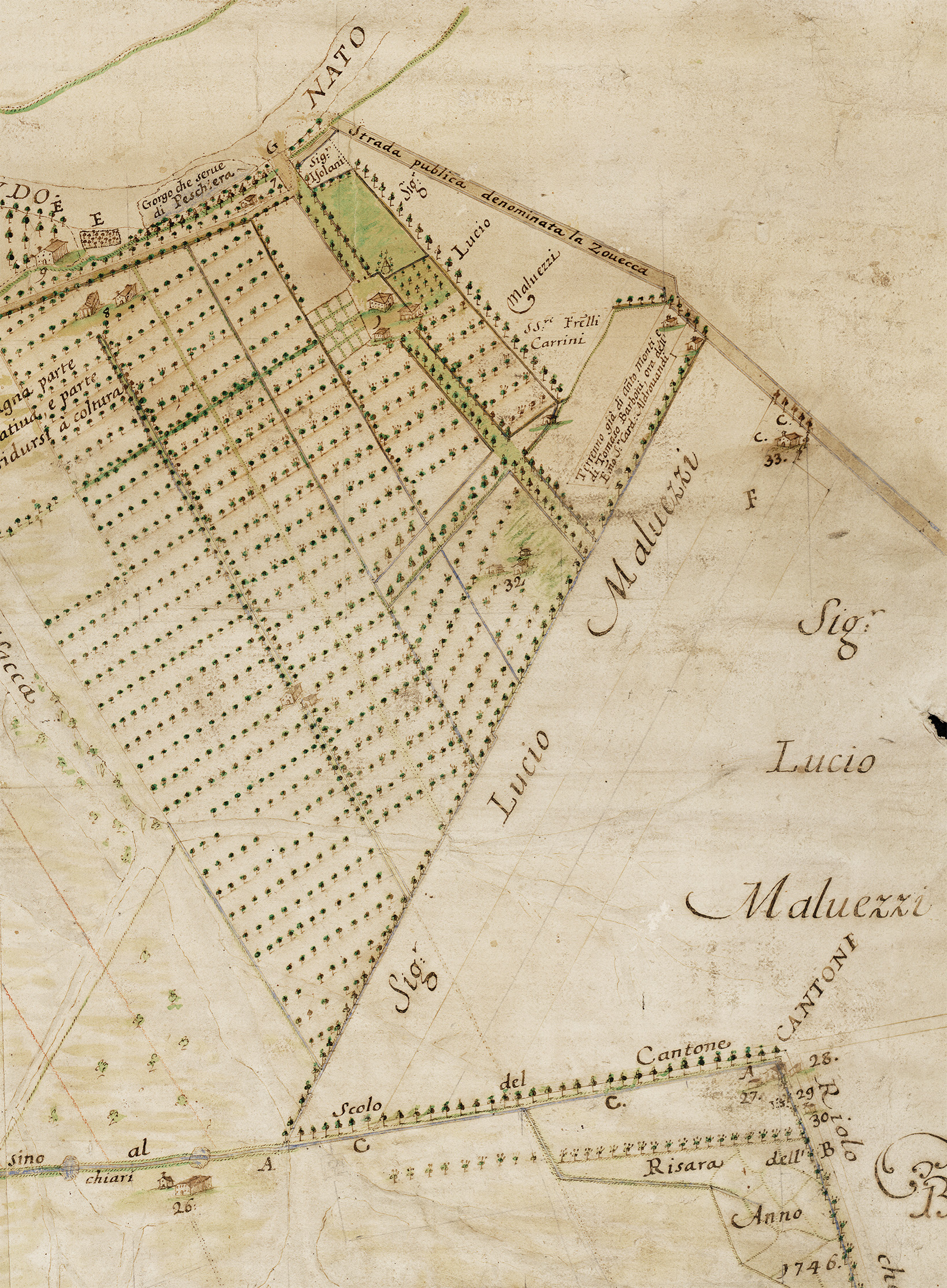 Ingrandite la Fig. 1, cliccando su di essa e premendo poi contemporaneamente i tasti Command e ‘+’. Potrete così notare maggiori dettagli e la strada di confine si rivelerà essere disegnata come una strada: un doppio segno con il filare di pioppi sul lato della proprietà Aldrovandi. Ciò rivela che i pioppi li ha fatti piantare il Cardinale: se il confine di proprietà correva, come d’uso, in corrispondenza della mezzaria della strada non poteva certo piantarli lui anche dal lato del Malvezzi. Il vecchio Malvezzi, Giuseppe, non era certo propenso a collaborare: è un animale stravagante, scriveva nel 1735 il fattore Moratori al Cardinale. E per tenerlo buono l’Aldrovandi aveva già dovuto acconsentire alle sua insistente richiesta di cedergli la Mendicanta, la tenuta che il Cardinale possedeva interclusa nella proprietà Malvezzi (Fig. 2). Siamo dunque certi che quella sul confine fosse una strada.