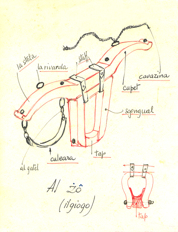 Il giogo: strumento di legno attaccato al timone del carro o alla bure (il telaio portante) dell’aratro, che, posto di traverso sul collo di due buoi, li accoppia nel traino.