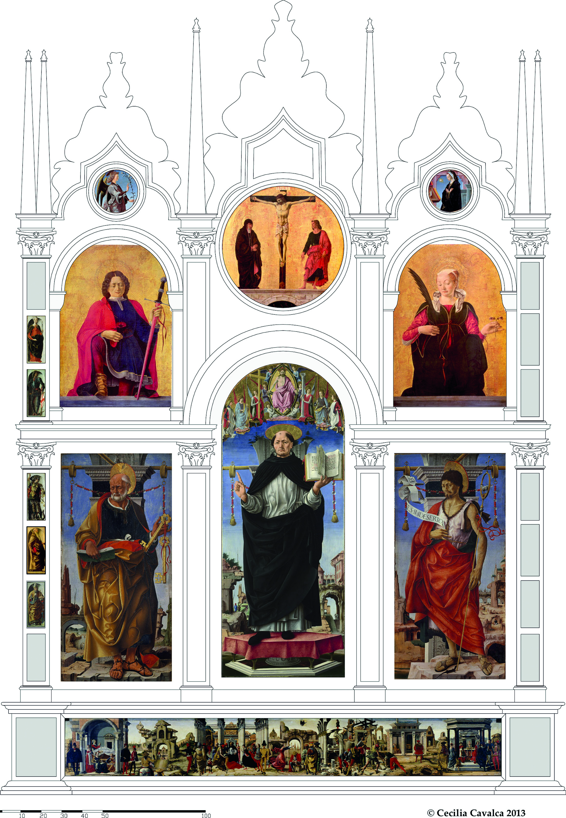 “I pannelli sono registrati negli inventari del Palazzo, compilati dal perito Tommaso Rinaldi, senza alcun riferimento attributivo nel 1752, alla morte del cardinale, e nel 1764, quattro anni dopo la morte del suo erede: il senatore Riniero Aldrovandi Marescotti. Sono ben riconoscibili le citazioni del pannello centrale, creduto un San Domenico, dei due laterali con San Pietro e San Giovanni Battista, della predella, del tondo della Crocifissione e dei due tondini dell’Annunciazione. Quanto agli altri, la citazione generica non consente riconoscimenti indubitabili, ma, tra la citazione della predella e quella degli scomparti laterali del primo registro, che risultano essere appesi nella cappella del Palazzo [che allora si trovava sopra la sala del odierno museo in cui sono esposti gli strumenti di lavoro agricoli] è inserita la citazione di cinque piccoli quadretti rappresentanti Santi. La stima del loro valore è alquanto bassa: la predella è valutata lire dieci, i Santi Pietro e Giovanni Battista lire cinque ciascuno e il San Vicent Ferrer lire dieci., mentre un baldacchino all’antica con sue bandinelle e testiera posto sopra il letto, il tutto di broccatone argento falso, è stimato lire venti, più dell’insieme delle tre tavole del registro principale”[3].