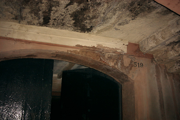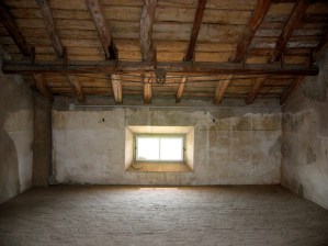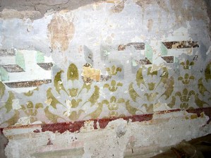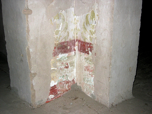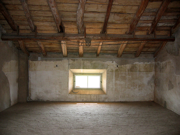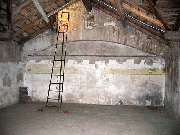 Lo si deduce dalle tracce di cornici affrescate che si leggono su alcune pareti del sottotetto in prossimità del pavimento (foto 8 e 9).