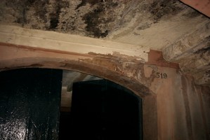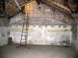Sempre nel sottotetto è ben riconoscibile nell’intonaco della parete nord-ovest la traccia dei puntoni (foto 10) che sostenevano la falda del tetto prima delle costruzione della torretta dell’orologio, che è sostenuta dall’arco visibile nella foto. Si noti come la linea di separazione tra l’intonaco scuro e quello più chiaro riproduca esattamente la linea lungo cui si incassano falda e puntoni nella facciata sud-est (foto 11).