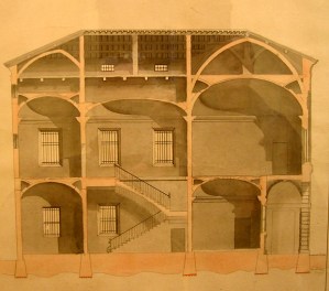 – L’accesso allo scalone progettato dal Torreggiani è plausibile si trovasse dove oggi si trova la toilette del museo e occupasse quel vano e quello dell’attiguo locale caldaia. L’altezza originaria del piano terreno permetteva l’accesso all’androne anche alle carrozze, che potevano così entrare per scaricare i passeggeri di fronte allo scalone e poi uscire dalla porta opposta a quella da cui erano entrate.