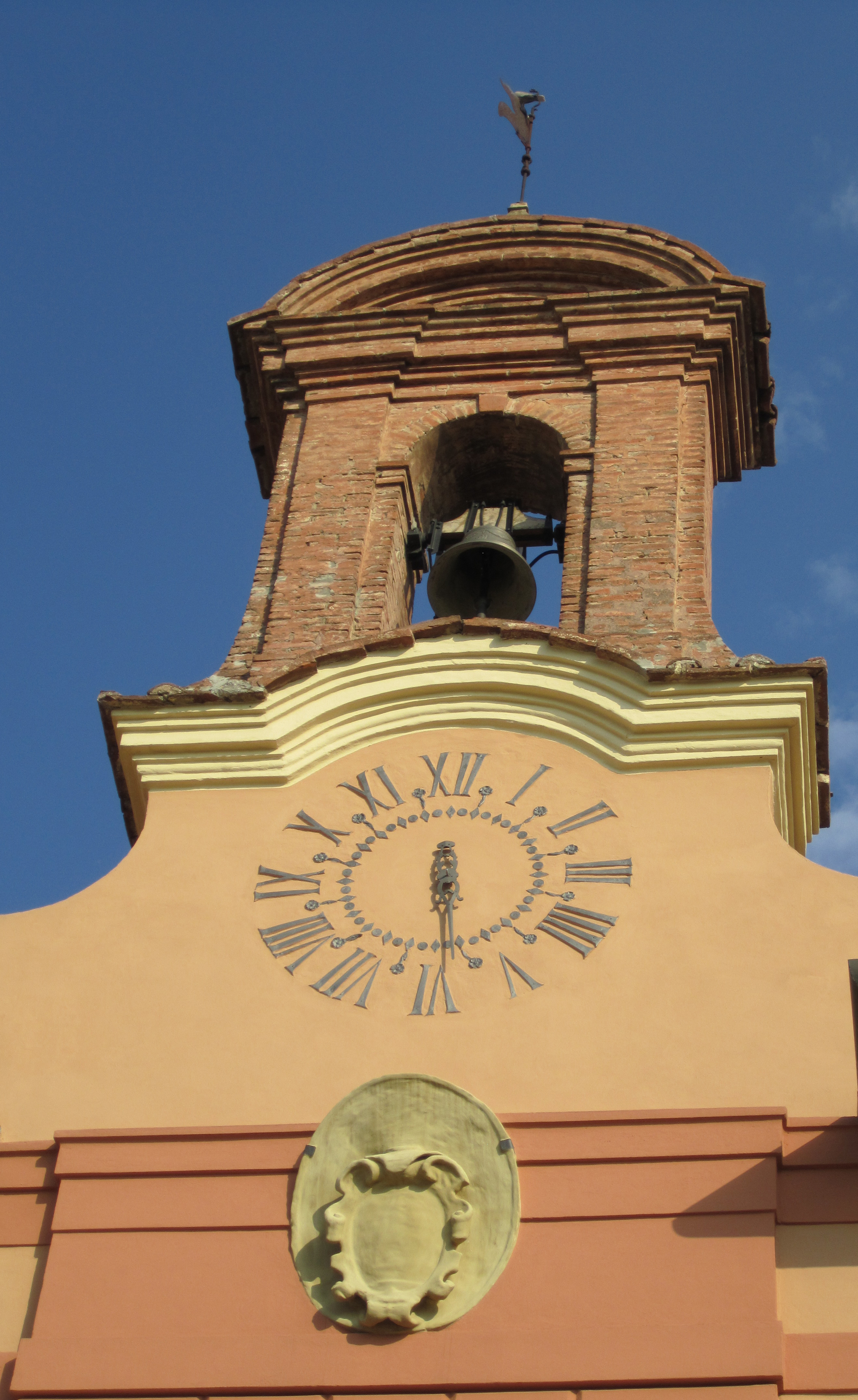 - L’orologio e la campana, con cui batte l’ore, posti sul prospetto anteriore furono commissionati ad artigiani specializzati di Venezia e Ravenna. Come usava all’epoca per gli orologi da facciata, l’orologio ha solo la lancetta delle ore.