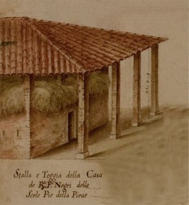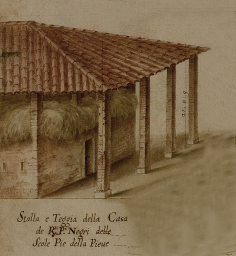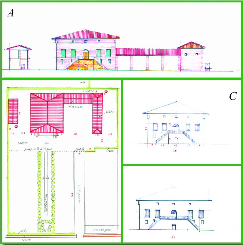 Nell’erigere il Palazzo vennero utilizzate le strutture dell’antica Casina dei Ruini, di cui abbiamo parlato nel Pannello 14 della Sezione l’Uomo. Essa compare per la prima volta in una mappa del 1561 e, successivamente, con vista prospettica e pianta, in un rilievo del 1659 che riproduciamo qui sotto. Da esse apprendiamo che la Casina era una barchessa, del tipo di quella nel disegno qui a lato, costituita da un alto portico, parzialmente chiuso al piano terreno a formare dei locali: magazzini o stalle. Per erigere il suo Palazzo il Cardinale chiuse il portico sul suo intero perimetro (come mostra la linea rossa tratteggiata nella pianta) e per tutta la sua altezza; ricavò poi un androne passante centrale rimuovendo le spalle delle porte (che nel rilievo sono curiosamente rappresentate in vista frontale, anziché in pianta). Ancor oggi, sulle pareti dell’androne sono riconoscibili i pilastri originali della barchessa, fateci caso durante la visita.