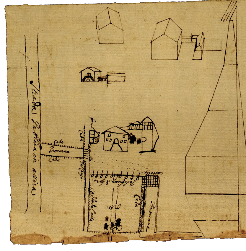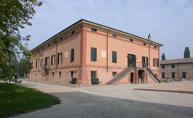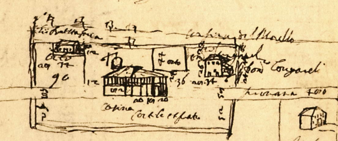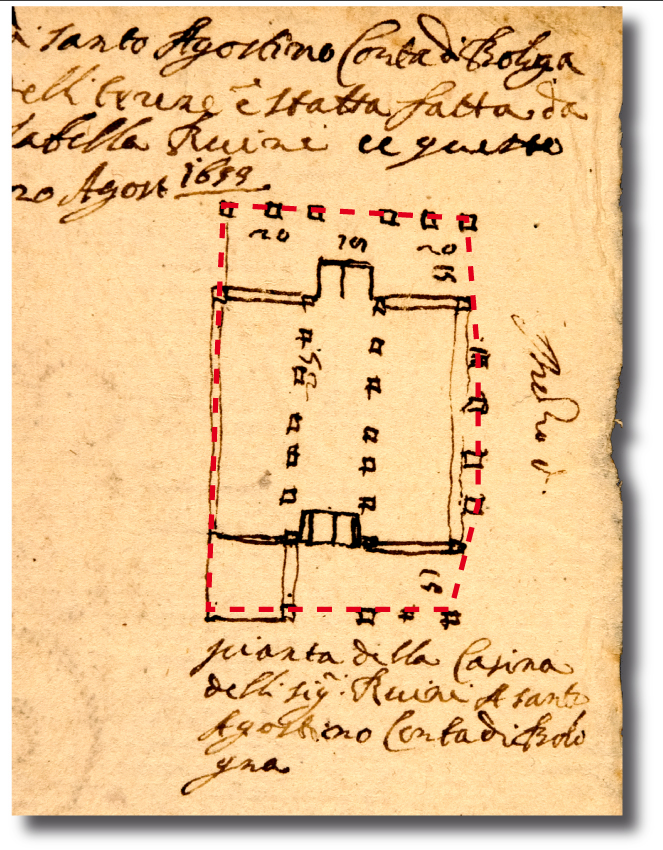 I Ruini, che nel XVII secolo possedevano le terre che diventeranno l’Impresa del cardinale Aldrovandi e poi la Tenuta Sessa, avevano costruito un Palazzo, che compare in molte carte, ad esempio nella mappa 13 esposta nel Pannello 14 della Sezione il Territorio. Oggi esso non esiste più; sorgeva là dove oggi si trova la cascina Molino, tra Mirabello e S. Carlo. Negli anni ‘70, sotto il prato di quella corte si rinvennero grossi muri. Eccezion fatta per quelle poche rovine, del Palazzo Ruini rimangono solo i due disegni riprodotti qui sotto, rilevati, il 5 e 6 Giugno 1653, dall’agrimensore G. Toschi di Bologna.