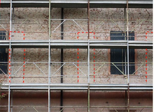 Questi ritrovamenti erano di per se sufficienti per concludere la continuità tra la casina e il Palazzo. Restava solo una curiosità: l’altezza di Palazzo sembra eccessiva per una barchessa, nel corso della trasformazione l’edificio era forse stato alzato? La risposta si è avuta durante i lavori di restauro dopo il sisma del 2012, che ha gravemento leso gli intonaci delle facciate. La loro rimozione ha messo in luce la tessitura delle murature (Fig. 13) che mostrano come i pilastri originali terminassero all’altezza delle finestre del primo piano (Fig. 14 e 15).