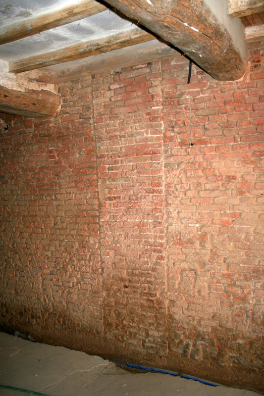 Nel 2004 erano già stati individuati alcuni pilastri nelle pareti dell’androne al primo piano (Fig. 11), dove solo qualche mattone inserito a mo’ di morsa li lega alle murature di tamponamento (Fig. 12).