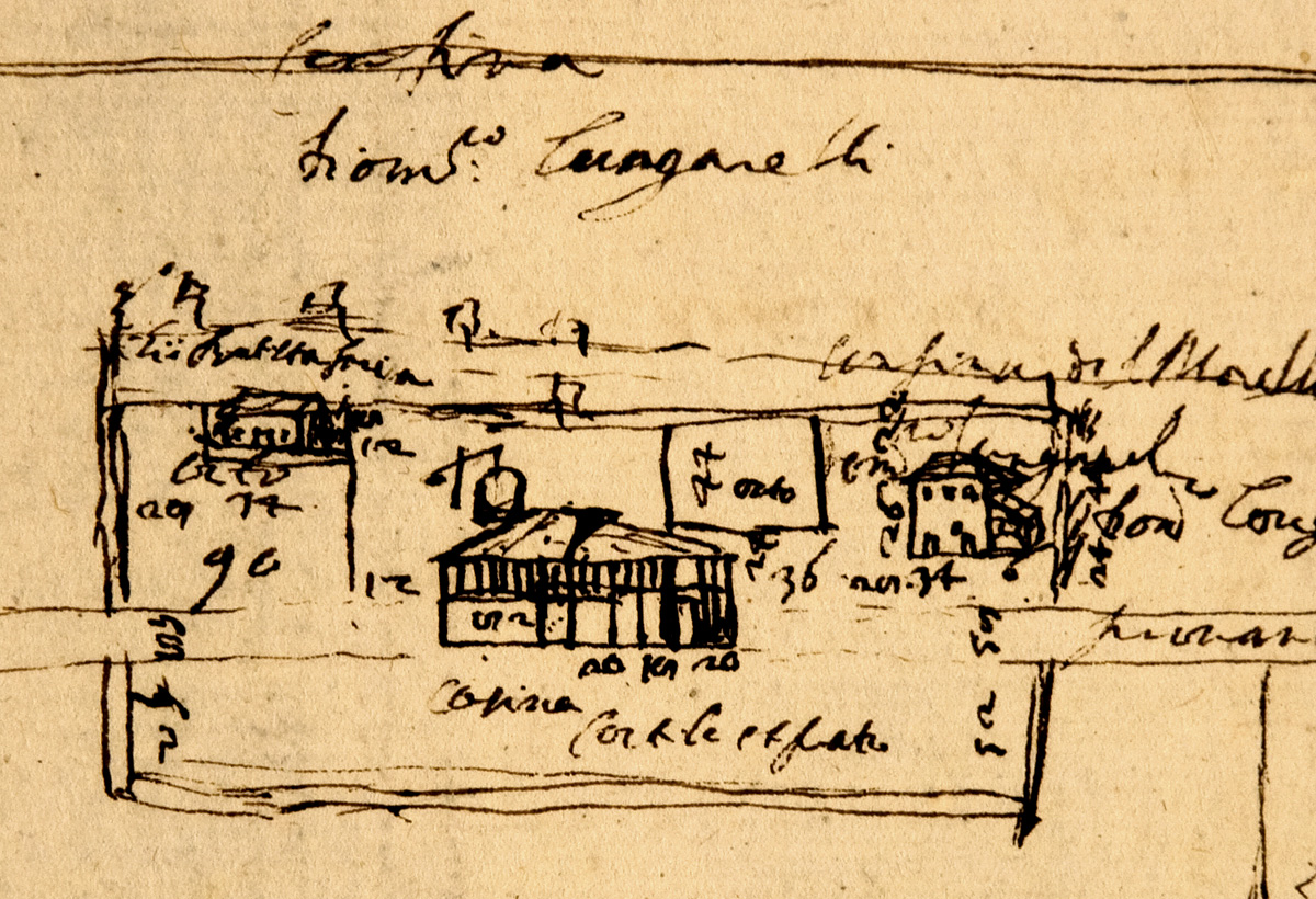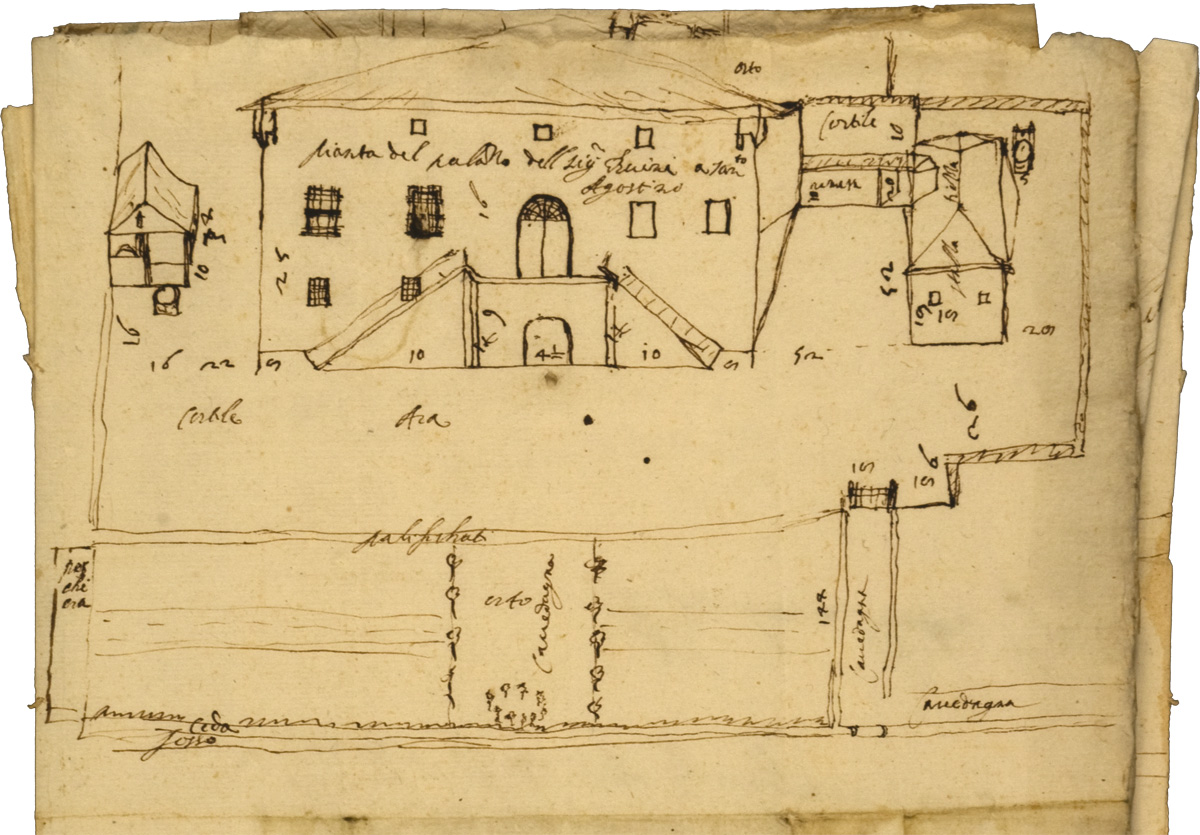 Il nuovo Palazzo non fu probabilmente costruito dal nulla. Jacopo parla di una casina la cui vista prospettica riporta sulla mappa di Fig. 1 (particolare in Fig. 3).