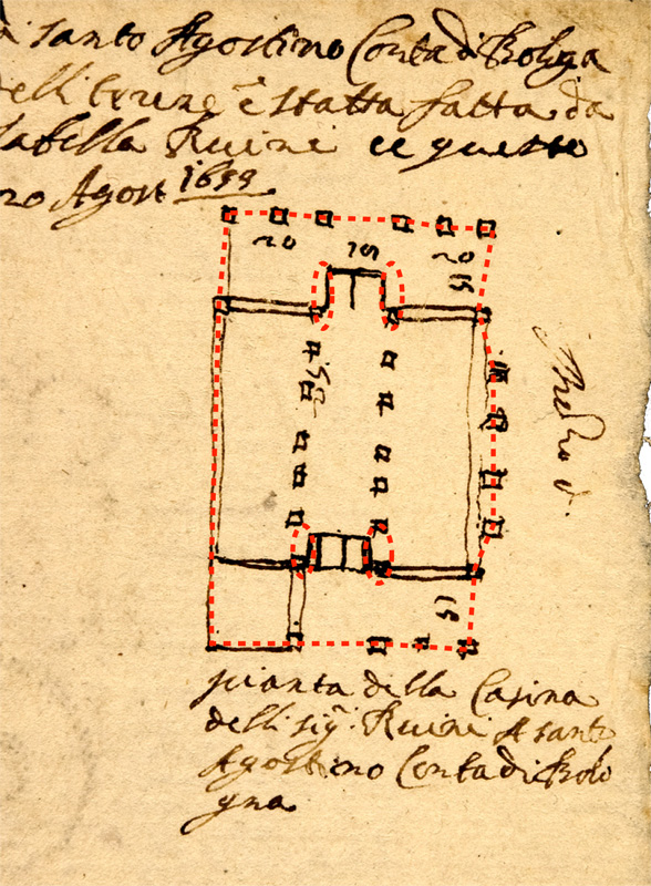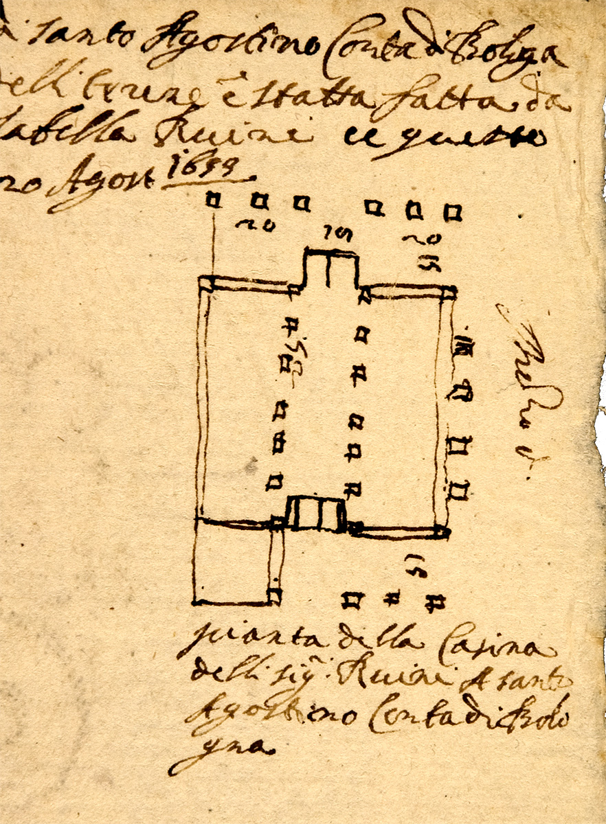 Pianta et sito del Impresa delli illustrissimi Signori Ruini posto a Levante del fiume Reno in Com. di S. Agostino, Contà di Bologna, fatta a passi che serva per misura, posta con li suoi casamenti et siti come si vede et la misura delli terreni è statta fatta da Jacomo Redolfi da Cento et io avendo visitato detto sitto e fatto la pianta alla Sig.ra Duchessa Isabella Ruini … questo dì 20 Agosto 1659.