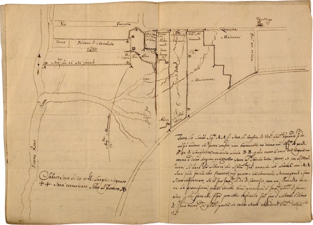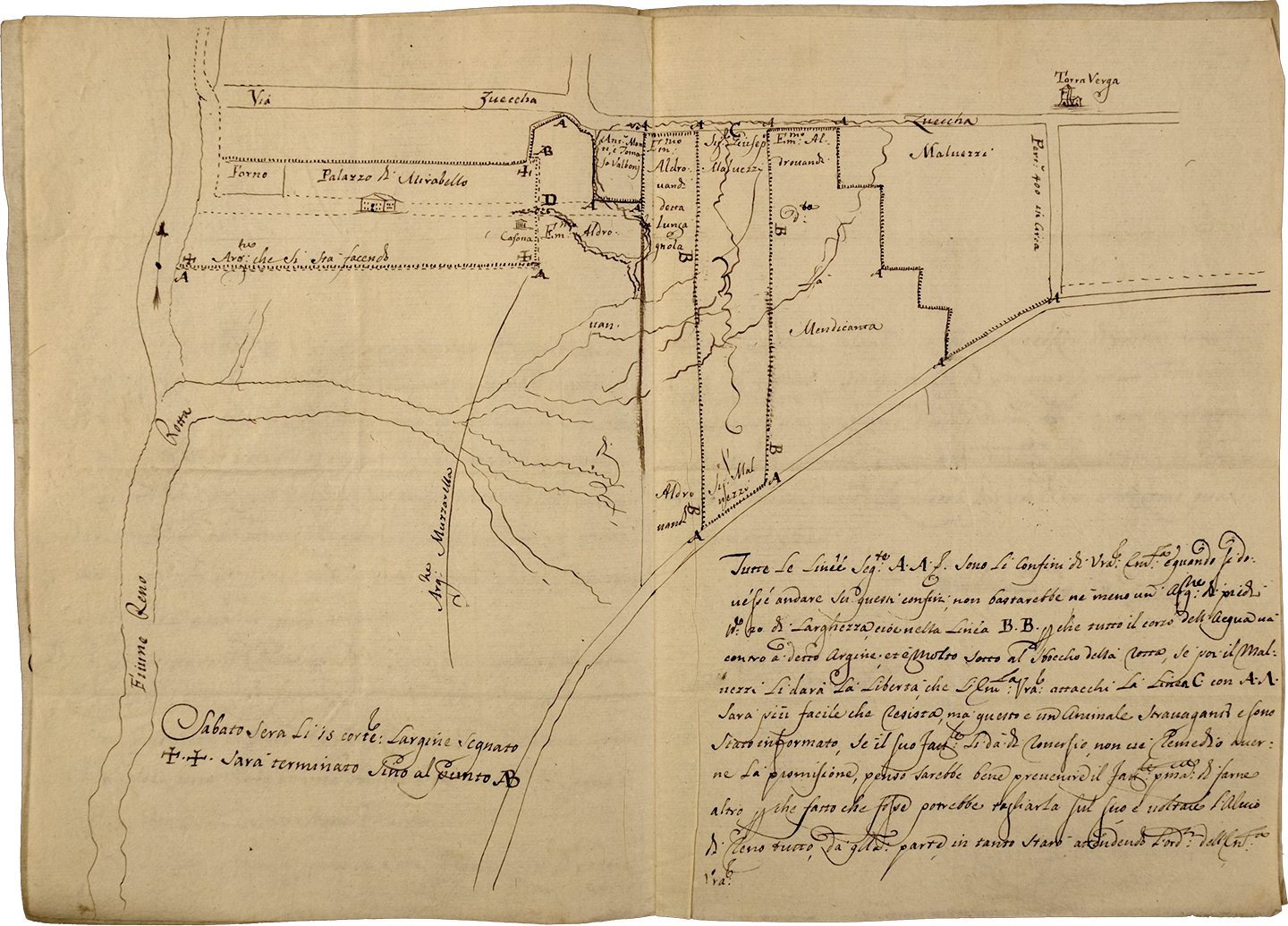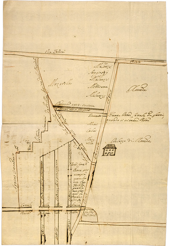 Nell’ottobre del 1735, Angelo Moratori, l’agente del Cardinale che sovrintendeva all’Impresa di Mirabello, informa il suo padrone che, dopo la rotta dell’anno precedente alla Bisacca, durante le piene il Reno inclina verso il Palazzo. Poi continua: direi secondo il mio debole intendere essere necessario tarapinare* [costruire un terrapieno] attorno li muri del Palazzo per una larghezza di 20 piedi [circa 8 metri] in altezza di piedi 2 [80 cm] con alzare il Piano del Palazzo al pari del terrapieno acciò la sortia [affioramento d’acqua prodotto dal sifonamento del terrapieno durante successive esondazioni] non entri nel Palazzo e procurare che ogni volta che viene delle piene fare che l’acqua non vadi verso Palazzo, et in un paio d’anni mettere l’abitazione in sicuro per l’avvenire.