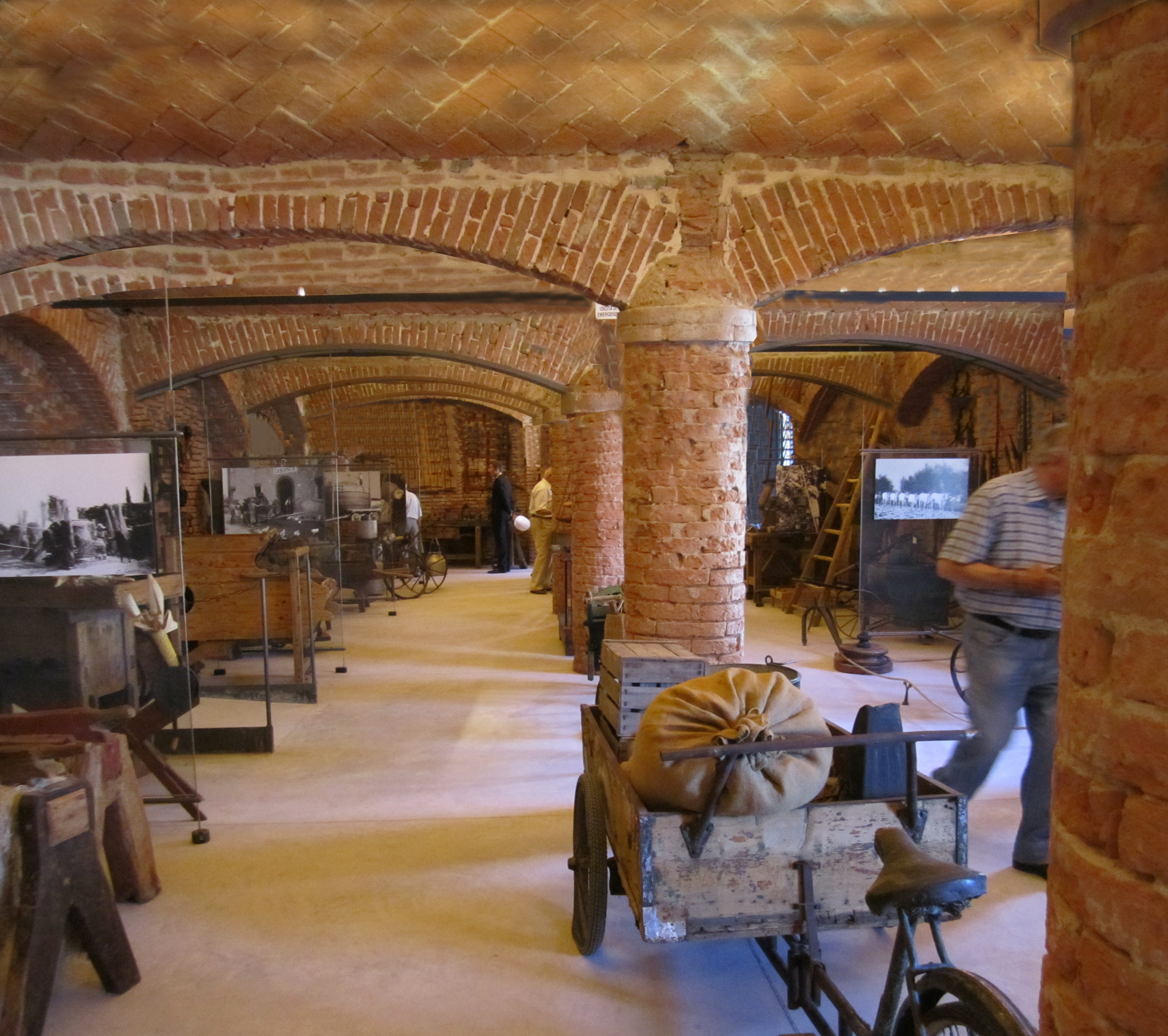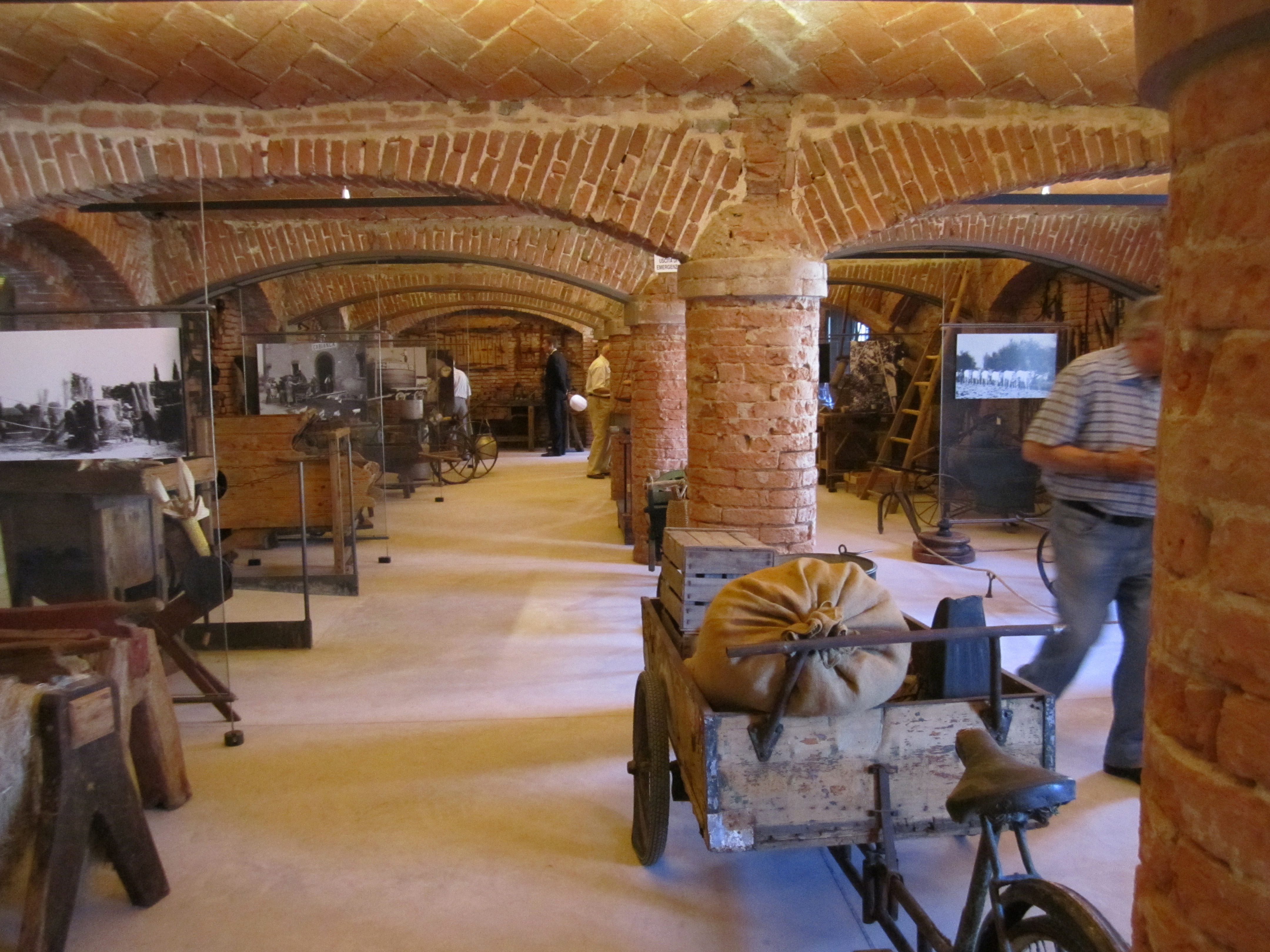Dallo stato dei luoghi si deduce che il consiglio fu seguito: il livello del piano terreno fu innalzato di circa 3 piedi con uno strato di lezza (terra torbosa) su cui fu posato un pavimento in cotto: è il pavimento che appare all’ingresso di questo androne, a una quota un poco inferiore a quella del pavimento attuale, e che incontrerete anche in altri locali. Tutt’attorno al Palazzo il terreno fu portato alla stessa quota per colmata, sfruttando le rotte successive. L’innalzamento della quota del pavimento rese inservibili le porte che si aprivano sull’androne. Pertanto, esse furono pertanto murate e nuove porte furono aperte a quota più alta. La posizione di quelle originarie è ancor oggi denotata dalla presenza di aperture tamponate, la cui modesta altezza, del tutto insufficiente al passaggio di una persona, rivela come una volta esse fossero molto più alte. Ne vedete un esempio qui sotto a sinistra.
