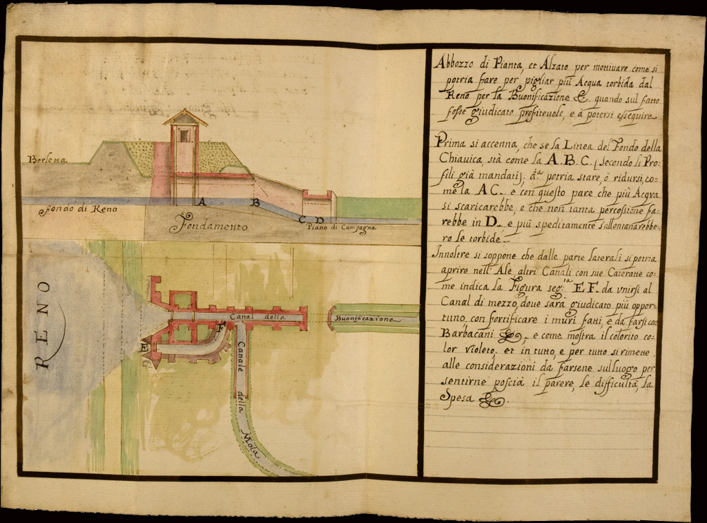 II cardinale Pompeo mobilitò tutte le persone di sua fiducia, tra questi il suo fattore Monti, i periti Bordoni e Bonaccorsi, i consulenti bolognesi Piacentini e Angelini, l’architetto Cassani, e con loro studiò una serie di progetti, dopo aver fatto rilevare con cura i livelli e le pendenze del terreno e aver ricostruito la storia e le vicende del fiume. Il cardinale ascolta tutti, poi decide di sua testa, anche quando qualcuno lo mette sull’avviso che la spesa è eccessiva e il risultato malsicuro. Fa piantare gradizzi[1] ed elevare argini per regolare le torbide, e dà inizio alla costruzione della chiavica2, una grande opera in muratura (vedi prospetto 16.2 e progetto 16.5), vero centro economico della Impresa Aldrovandi” un’opera notevole ma anche malfida perché posta uno dei punti più delicati deIl’arginatura di Reno tra S. Carlo e Mirabello, tra la bòtta Annegati e la bòtta Bisacca. Le opposizioni all’opera furono molte; ammettere che un privato potesse a suo piacimento inondare terre al di qua dell’argine del Reno, presuppone l’accettazione di una inevitabile conseguenza: utilizzate per il vantaggio degli Aldrovandi le torbide, le acque chiare sarebbero scolate nei territori limitrofi, allagando con gravi danni e senza possibilità di futuri vantaggi le terre dei vicini. Pressoché indifferente il Sampietri, le cui terre erano poste a monte e protette da un robusto argine sul confine con gli Aldrovandi; stabilito un accordo coi Piatesi, che non vollero vendere le paludi attorno a Raveda, ma che accettarono di affittarle a Pompeo, autorizzandolo a tentare su di esse la bonifica; il cardinale affrontò l’intesa dei proprietari interessati che si opposero all’autorizzazione che l’Assunteria delle Acque avrebbe dovuto dare alla sua iniziativa.