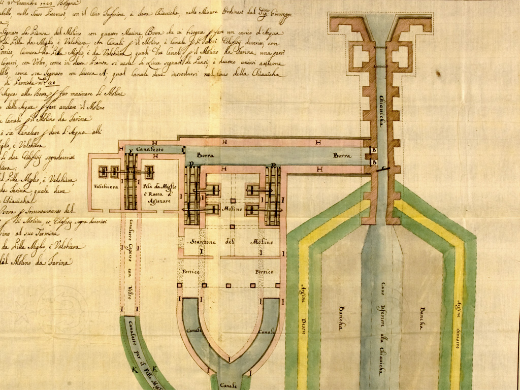Progetto 16.5 – 1723 – Progetto della Chiavica (con il canale per la bonifica dei terreni) e del molino con ruote da grano, da affilare, da inerti e gualchiere