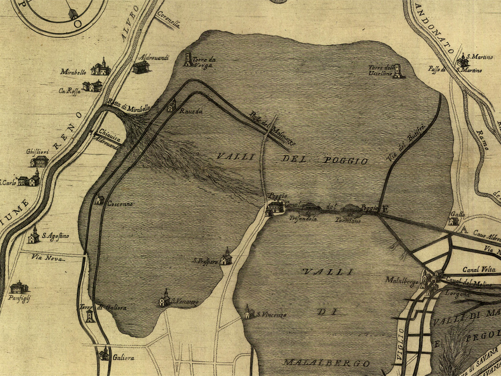 [2] I fatti non si svolsero esattamente così, gli autori non hanno correttamente decifrato il complesso carteggio, reso oscuro da un terminologia tecnica oggi non più in uso. La chiavica fu approvata e realizzata legalmente, e nel 1724 iniziò a lavorare. Dopo un paio d’anni di esercizio il cardinale si rese conto che la colmata dei suoi terreni (cioè l’innalzamento del loro livello mediante il deposito delle torbide portate dal fiume) avrebbe richiesto 45 anni. Per questo nel settembre del 1726 scrisse al fattore la lettera, citata nel testo e riportata nel Pannello 18, con cui ordinò al fattore di fare quanto sopra descritto per provocare intenzionalmente una rotta del Reno sulle sue terre. La colmata che ne sarebbe conseguita si sarebbe così realizzata in un sol colpo, il cardinale l’affermò nella lettera e i fatti gli diedero ragione. Qualche anno dopo (una rotta richiede una grande piena e una grande piena non si presenta tutti gli anni), il Reno ruppe alla bòtta Bisacca (febbraio 1731, mappa in Pannello 18), nella località che da allora è detta Rotta Bisacca. Non fu però più possibile riportare il fiume, come il cardinale aveva progettato, nel suo alveo e così il Reno vagò per mezzo secolo nella campagna tra Mirabello e Poggio Renatico. Il cardinale tentò di condurlo al Po di Primaro, facendo realizzare a sue spese il cavo Aldrovandi, ma non vi riuscì. Solo con la realizzazione nel 1782 del cavo Benedettino, il Reno fu imbrigliato. Ma gli alti argini di questo impedirono il deflusso delle acque dei terreni posti alla destra del cavo, che diedero origini a nuove paludi (valli). Solo con la realizzazione della Bonifica Renana nel 1909 e la costruzione dell’impianto idrovoro di Saiarino nel 1925 il problema posto dal Reno fu risolto. La lettera dell’Aldrovandi se da una parte provocò un disastro ambientale tanto grande da richiedere due secoli per risanarlo, dall’altra portò, come previsto dal cardinale alla colmata delle terre di Mirabello che assunsero l’aspetto attuale. N.d.C.]