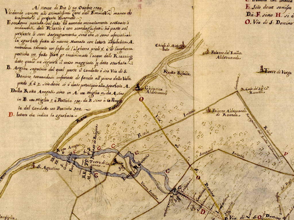 Mappa 7.9 – 1744 – La Navigazione dell’Emin.issimo Aldrovandi mostra il percorso per arrivare alla Chiavica Aldrovandi dalla valle del Poggio [da una lettera del Cardinale Aldrovandi; Arch. Stato Bologna, Archivio Aldrovandi, vol. 395, fasc 2]