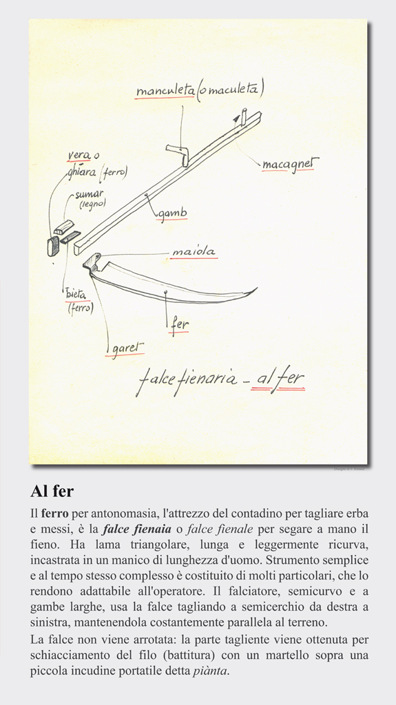 Pannello con descrizione della parti di una falce (al fer) [Disegno di F. Rinaldi]