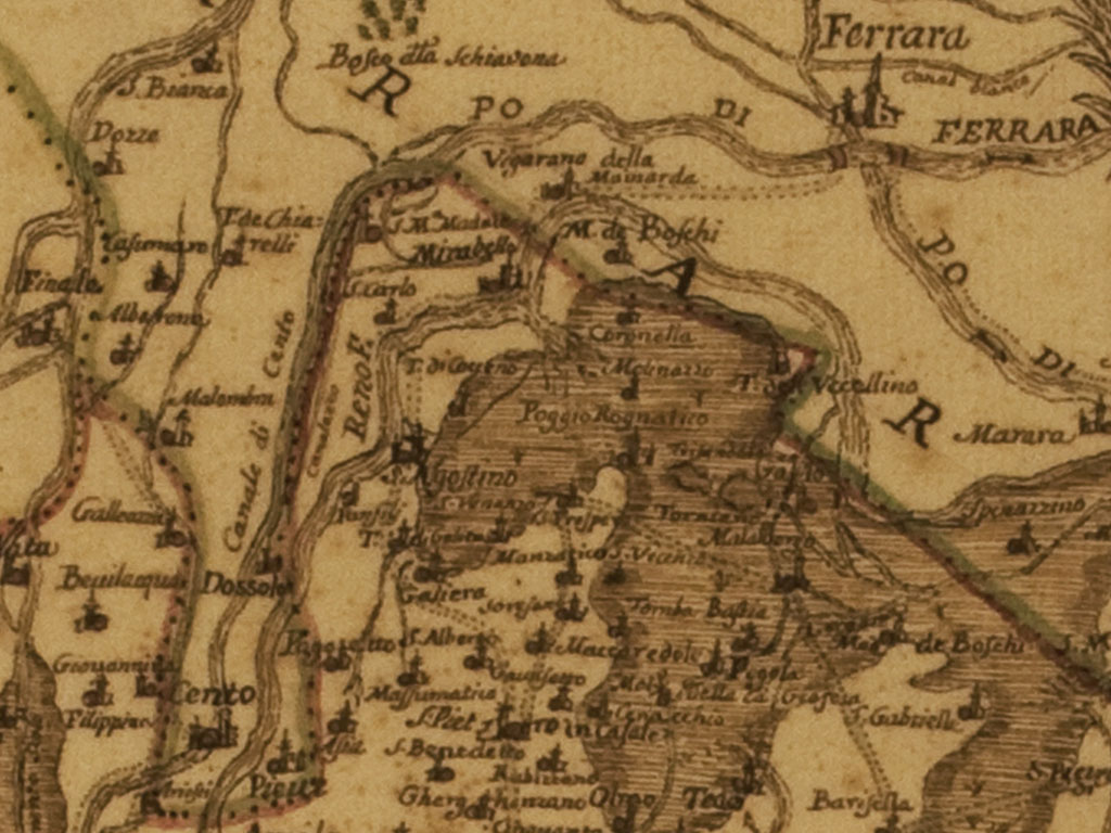 Il territorio venne a poco a poco a definirsi sempre meglio e ad acquistare una propria fisionomia e un crescente valore economico. Si accesero allora vecchie e nuove diatribe sull’esatta posizione dei confini tra gli interessati: sia fra Stati e confraternite (Nonantola, Olivetani di Bologna e di Ferrara, etc.), sia fra i privati proprietari di beni di quelle terre. Di conseguenza la cartografia andò assumendo una sempre maggiore importanza, quale elemento documentario indispensabile per un’esatta lettura del territorio. Carte approssimative o scrupolose, mappe e frettolosi rilievi, schizzi per precisare particolari d’interesse locale si moltiplicarono e furono gelosamente conservate negli archivi delle Assunterie dei Confini e delle Acque e nelle raccolte degli Agrimensori. Variano le misure usate (pertiche bolognesi o ferraresi, passi, etc.) e le scale. Inutile pretendere precisione assoluta o rispondenza alla tecnica della cartografia moderna, ma la lettura di questi documenti risulta generalmente facile, rivelatrice e di grande interesse.