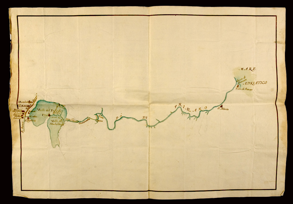 Mappa 7.8 – 1746 – Navigazione da Ravenna a Mirabello lungo i canali e le valli [da una lettera del Cardinale Aldrovandi; Arch. Stato Bologna, Archivio Aldrovandi, vol. 210, fasc. 19]