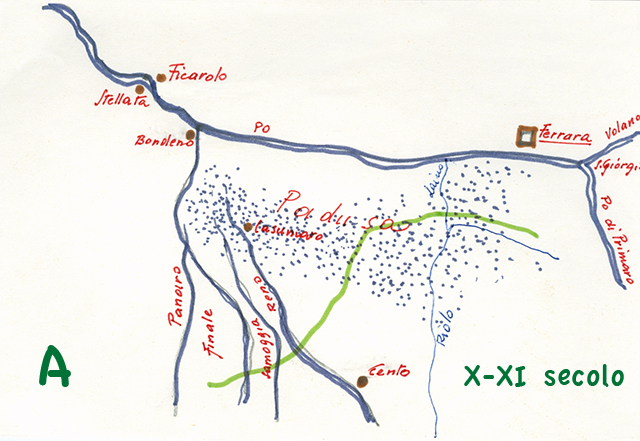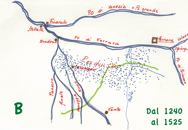 Fino al 1152 il Po si apriva nel delta solo a valle di Ferrara, ma in quell’anno (come mostra la figura B) una rotta a Ficarolo gli creò un nuovo sbocco al mare; più diretto e con maggiore pendenza, e quindi con maggiore portata, dei precedenti. Il nuovo ramo fu detto Po Grande, o Po di Venezia, per distinguerlo dall’antico corso che divenne il Po di Ferrara. Nel 1240 un ennesimo evento alluvionale provocò un cambiamento anche del corso del Reno, che si indirizzò verso il finalese, seguendo antichi paleoalvei, per confluire, non lontano da Bondeno, nel Panaro, affluente del Po di Ferrara. Ma nelle piene le sue acque continuavano a dilagare verso le valli del Poggio, di Malalbergo e di Marara, tanto che dal 1497 abbandonò il Panaro e si portò, passando tra Cento e Pieve, a nord di Sant’Agostino, per scaricarsi, disalveato, parte in Po, parte nelle valli.