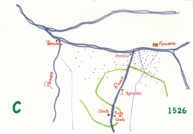 A seguito della riduzione di portata conseguente alla rotta del 1152, il Po di Ferrara iniziò ad interrirsi, condizionando negativamente l’economia fluviale non solo di Ferrara, ma anche di Bologna, che utilizzava un suo ramo (il Po di Primaro o di Argenta) per la navigazione dalle valli al mare. Per scongiurare il rischio di perdere la sua via d’acqua, Bologna iniziò un lunga e costosa opera di arginatura dei fiumi appenninici per immetterli nel Po di Primaro. Ottenne così anche un gradito effetto secondario: liberò dalle acque vaste zone della Padusa. Alla fine del XV secolo erano già stati inalveati Santerno, Lamone, Senio, Sillaro, Quaderna, Gaiana e Savena. Vi furono lunghe trattative fra Bologna e Ferrara per incanalare il Reno nel Po a Porotto. Ferrara si opponeva. Nel 1522 si verificò una disastrosa esondazione del Reno, di cui il documento 1 ricorda gli effetti a Mirabello: gli eredi degli annegati chiedono di essere esentati dalle tasse che … i morti avrebbero dovuto pagare. A seguito di questa esondazione Ferrara accettò. Il Reno fu incanalato fra argini pressoché rettilinei da Sant’Agostino a Porotto, come mostra la figura C, e immesso nel Po di Ferrara, poco a monte della città e della divisione di questo nei due rami di Volano e di Primaro.