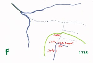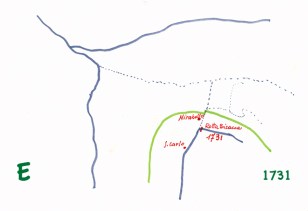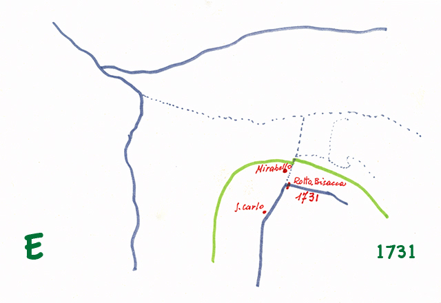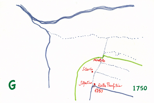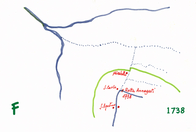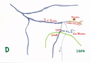 Solo nel 1604, dopo che l’opposizione papale a Ferrara era cessata, anzi era mutata in interesse essendo stato il Ducato inglobato nello Stato Pontificio, Ferrara ottenne che il Reno fosse “provvisoriamente” deviato e immesso nel Po di Primaro, a valle della città, passando attraverso la valle Sanmartina. Come mostra la figura D, l’idea è che, in tal modo, esso avrebbe deposto nella valle i materiali alluvionali prima di raggiungere il Po, preservando così il fiume dall’interrimento. Ma molto presto il fragile argine che doveva contenerlo verso il Bolognese cedette e il fiume dilagò nella campagna. La carta 4 ne mostra le conseguenze. Fu inevitabile cercare una nuova soluzione.
