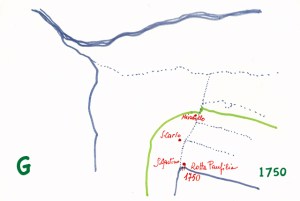 Le carte esposte illustrano alcune delle fasi di questa lunga storia. Vi suggeriamo di dedicare qualche minuto alle due foto satellitari in basso a destra, in cui particolari del territorio ancor oggi ben visibili sono associati alle loro origine nelle altre carte.