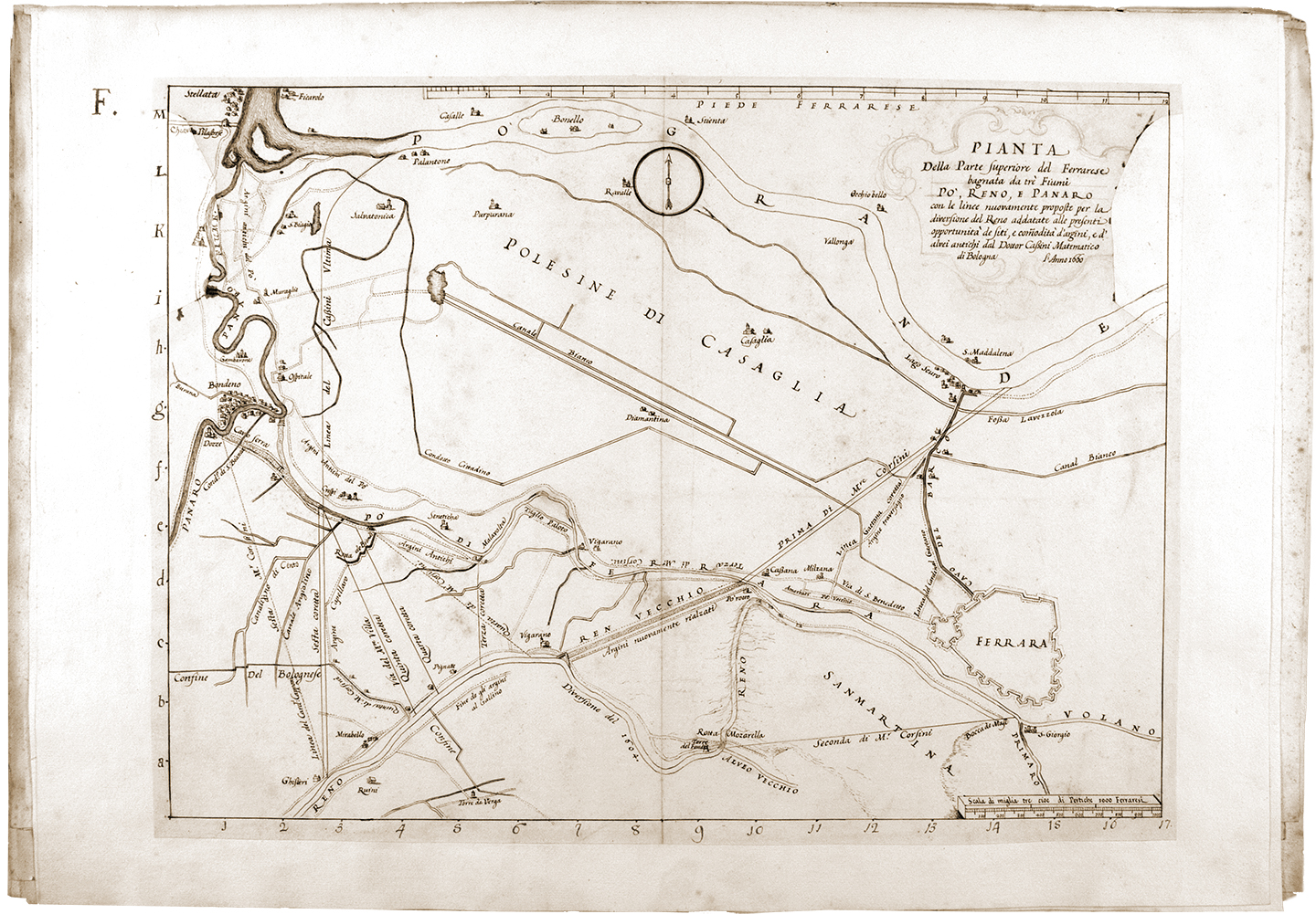 Alla ricerca di una soluzione lavorarono alcuni tra i più grandi scienziati dell’epoca. Ne ricordiamo solo uno: Giovanni Domenico Cassini, che iniziò la sua attività come pubblico matematico della città di Bologna (oggi si direbbe ingegnere capo). Fu così bravo e divenne così famoso che nel 1669 fu chiamato da Luigi XIV (il grande Re Sole) a Parigi per dirigere l’Observatoire Royal, allora appena fondato e, grazie ai mezzi messigli a disposizione dal re, scoprì la divisione degli anelli di Saturno che tuttora porta il suo nome. Fu uno dei massimi astronomi europei, tanto che la NASA ha dato il suo nome alla prima sonda spaziale lanciata verso i pianeti giganti. Bene! 9 anni prima di andare a Parigi il grande Cassini era a Mirabello: è firmata da lui la carta al numero 3 in cui propone un’interessante variante alla così detta sesta proposta di diversione del Reno, che era allora anche nota come la proposta dei Sigg. Bolognesi: tra le tante proposte di soluzione al problema del Reno essa era l’unica che prevedeva di costruire una deviazione, un canale, che scaricasse il Reno in Po Grande, preservando così da ulteriori interrimenti l’alveo del Primaro. La deviazione doveva iniziare a Mirabello, in corrispondenza della botta (cioè dell’ansa) Ghisleri, presso la Casa Rossa, per raggiungere l’antico alveo interrito del Po di Ferrara e, attraverso questo e il Panaro, il Po Grande. In questo disegno il Cassini raffina la proposta, suggerendo una più efficace, ma più costosa, variante che raggiunge direttamente il Po Grande.