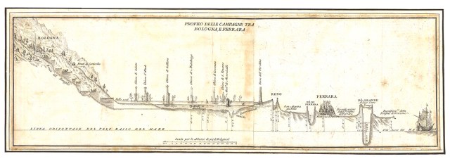 Guardiamo ad esempio il profilo al numero 8. Fu redatto nel 1760 e mostra l’altimetria delle campagne bolognesi e ferraresi, da Bologna al mare: rivela come nelle grandi piene la quota del pelo libero delle valli giungesse a sommergere chiese e torri; mostra che il livello del Reno era, anche in magra, molto superiore a quello della Valle Sanmartina. Come questa a sua volta sovrastasse Ferrara e come questa città fosse, ed è tuttora, incassata in una valle tra due fiumi, un polesine, chiusa tra gli alti argini del Po di Ferrara e del Po Grande. Sembra proprio un polder olandese. A destra una nave individua il livello del mare, che è più alto del fondo del Po, ed è per questo che l’acqua salata si insinua nel delta.