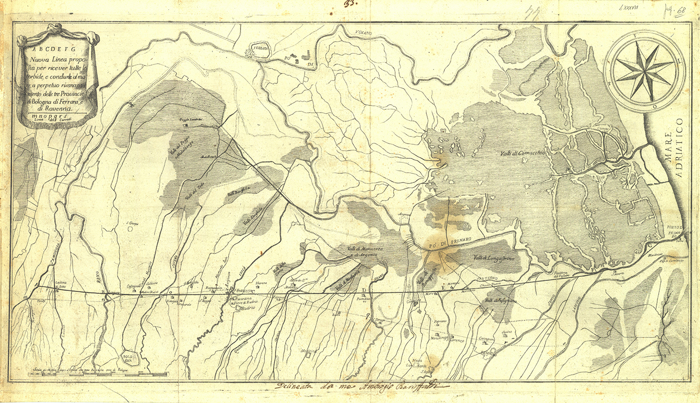La carta 3 è curiosa. Essa mostra quanto grande fosse l’interesse suscitato dal problema posto dal disalveamento del Reno, non solo tra gli addetti ai lavori, ma anche nell’opinione pubblica. E’ destinata alla grande diffusione e pur se di semplicissima fattura è orgogliosamente firmata dal suo autore. E’ certamente posteriore alla rotta Bisacca (dato che essa vi appare citata), ma ripropone un fantasioso progetto, avanzato nel 1725 dal Corradi, matematico del Duca di Modena, in un congresso a Faenza. Il progetto fu subito ritirato dallo stesso autore, perché platealmente errato, ma dieci anni dopo circolava ancora tra il pubblico.