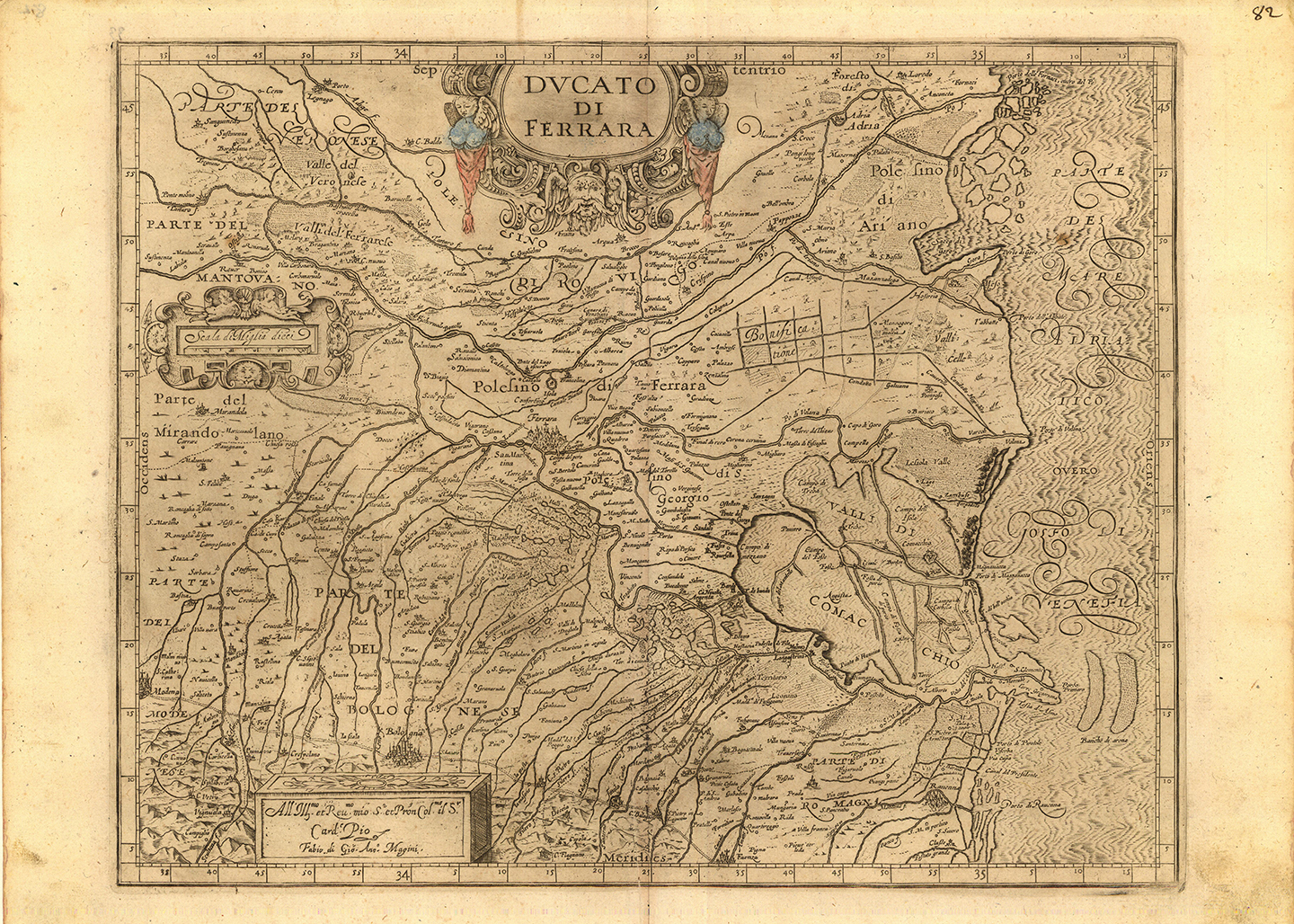 La carta riprodotta al numero 1 è tratta da questo atlante: è la carta del Ducato di Ferrara, disegnata nel 1599. In essa il Reno appare confluire ancora nel Po di Ferrara; la valle Sanmartina e quelle di Poggio e Malalbergo sono poco estese. Verso il mare è in corso la grande Bonifica Estense, là dove tre secoli più tardi sorgerà Jolanda di Savoia. Si noti il saliente che unisce Cento al Ducato di Ferrara, abbracciando il territorio di Sant’Agostino e Mirabello che appartengono invece a Bologna.