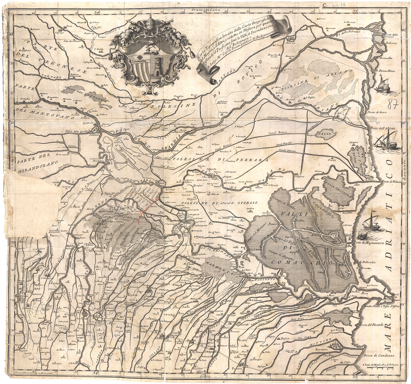 La lunghissima influenza del Magini nella cartografia è ben documentata anche dall’impianto e dal cartiglio dalla carta 5, realizzata da Luigi Casoli a Roma nel 1726. Di grande interesse sono sia i nuovi toponimi che compaiono nella nostra zona (si noti ad esempio l’Aldrovanda presso Mirabello), sia l’effetto delle rotte e delle inondazioni con cui si aprì il XVIII secolo: si noti l’estensione delle valli rispetto alla carta del Magini: l’Aldrovanda appare sommersa e solo un esile ismo di terra fa sì che Poggio Renatico non sia un isola in mezzo alla palude.