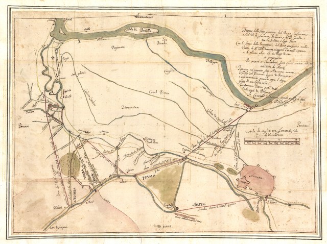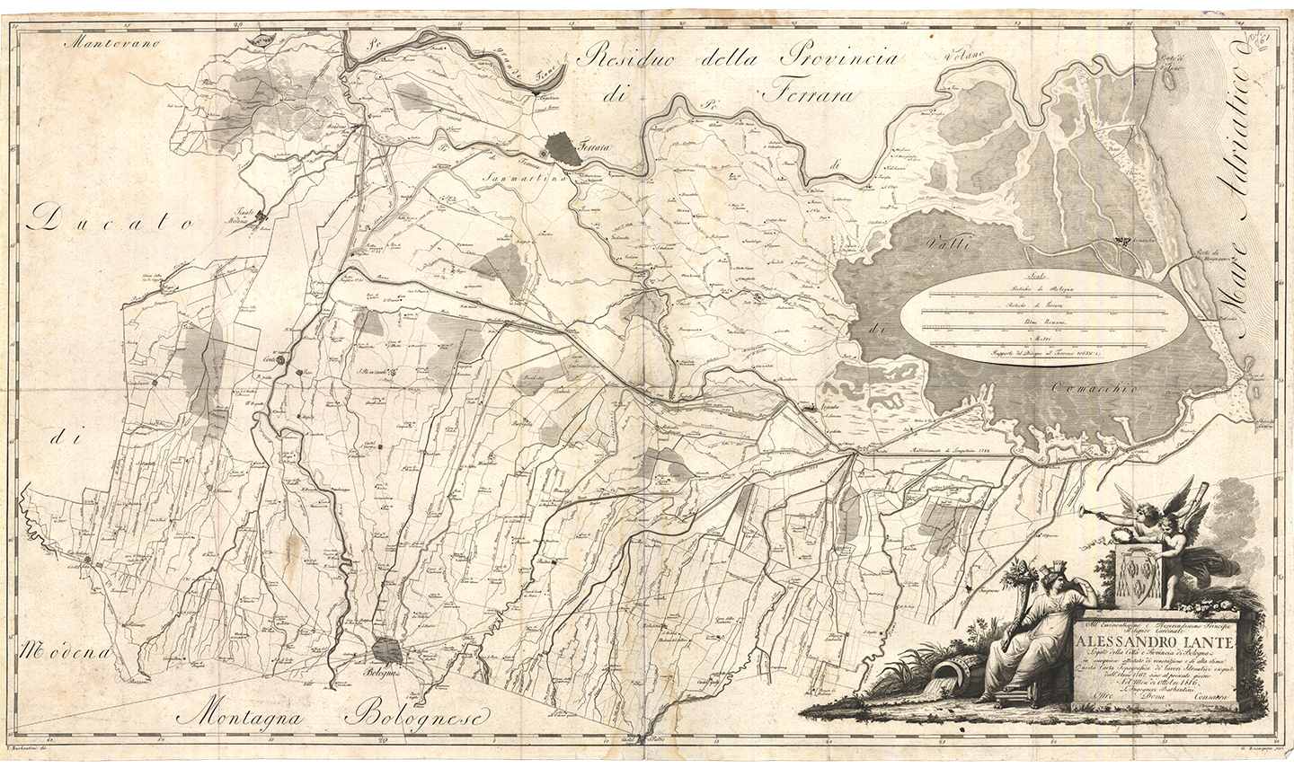 Oltre alle carte che descrivevano l’intero territorio degli Stati, venivano prodotte carte specializzate per specifiche necessità: ad esempio la pianificazione dell’assetto idraulico del territorio o la risoluzione di controversie su confini e proprietà. Ne proponiamo alcune relative al primo tema, certo il problema più grave e urgente tra quelli che gli abitanti di questa zona dovettero risolvere nei secoli scorsi. Le carte scelte documentano ulteriormente quanto esposto nei primi tre pannelli. Le abbiamo accompagnate con fotografie che mostrano scorci del paesaggio odierno che riflettono le condizioni prevalenti nel passato.
