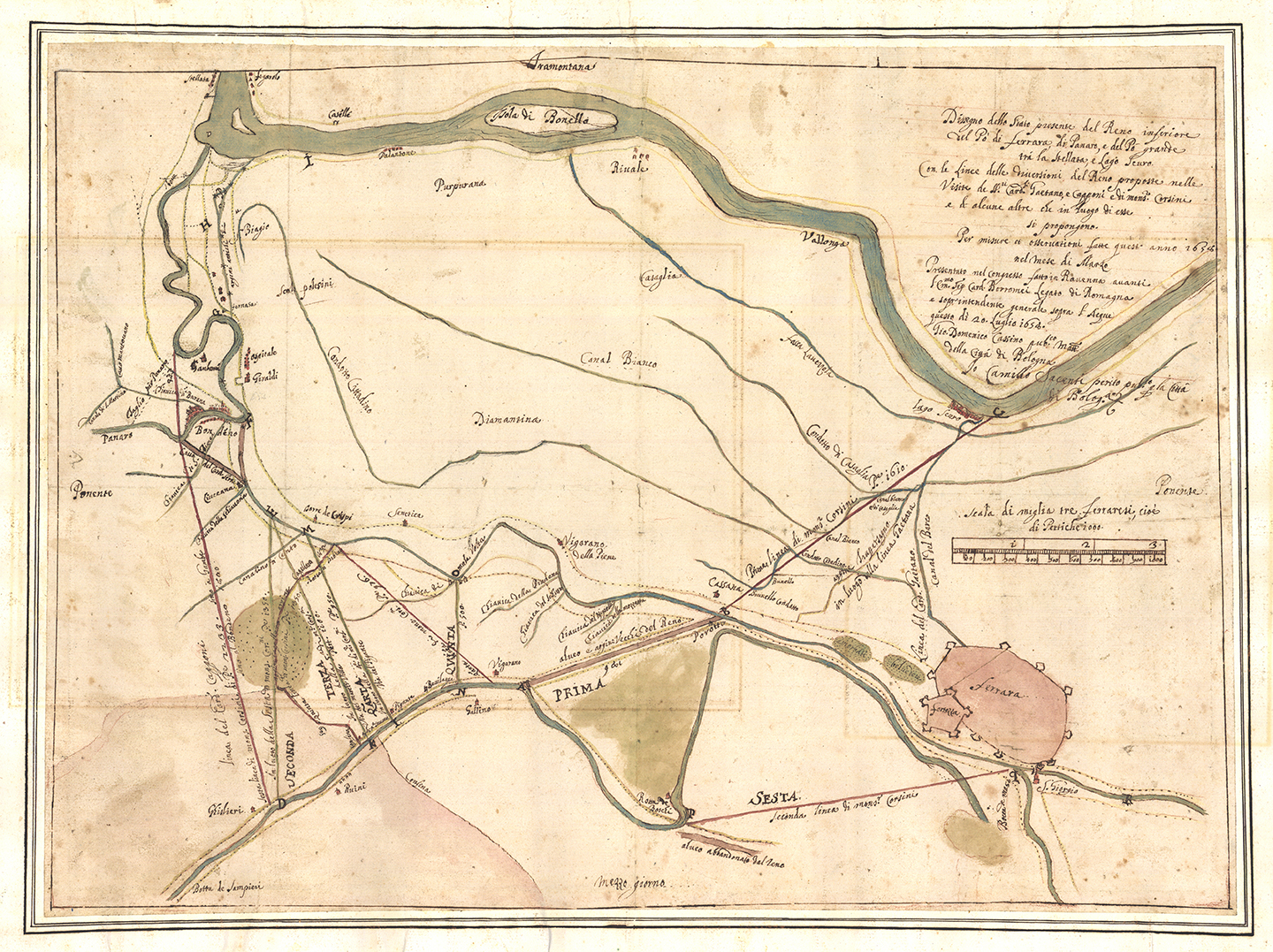 La pianta 2, del 1662, mostra il corso del Reno con lo stato delle valli del Poggio prima (linea azzurra) e dopo (linea rossa) la visita dei Cardinali Borromeo e Bandinelli. Durante quel sopraluogo Bologna era rappresentata da Giovanni Domenico Cassini (il grande astronomo di cui abbiamo già parlato) e Camillo Saccenti e si eseguirono le livellazione delle sei linee di diversione del Reno proposte dai bolognesi.