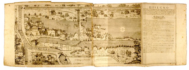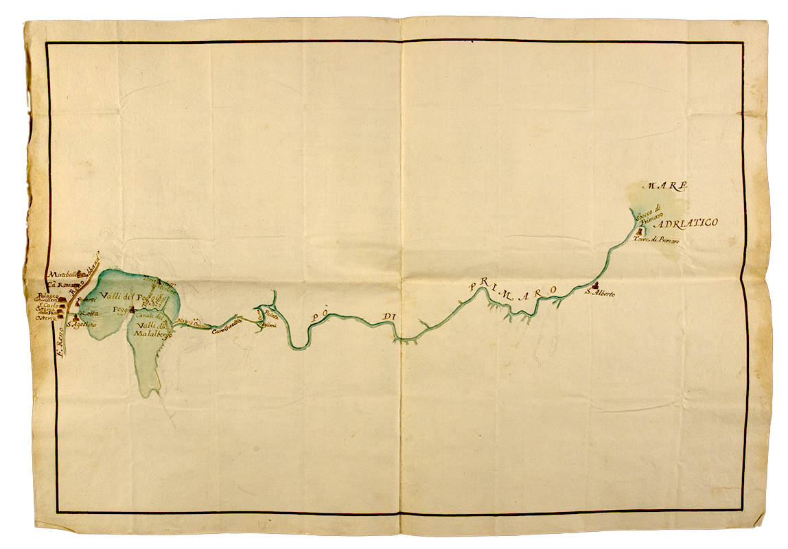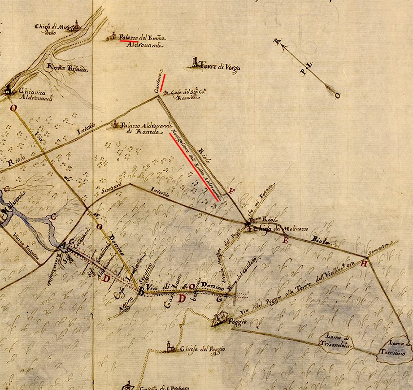 Una rete di canali minori e di scoli si irradiava dalle valli e permetteva di raggiungere, con piccole imbarcazioni, le diverse proprietà. Era così possibile, come mostra la carta 8, andare da Ravenna sino a Mirabello. Essa è tratta da una lettera del cardinale Aldrovandi, in cui progettava di utilizzare i suoi mulini per produrre chiodi con ferro dell’Elba, portato a Mirabello circumnavigando l’Italia, sino a Ravenna, e risalendo poi il Po e le valli sino al cantone di Riolo, il piccolo porto sul Riolo, a poche centinaia di metri dal suo Palazzo a Mirabello. Il Cardinale l’utilizzava per portarsi da Bologna a Palazzo in barca. Materiali e mobili per la costruzione e l’arredo del Palazzo di Mirabello (ne parleremo al pannello 17) giunsero da Bologna per la stessa strada. In senso inverso, viaggiarono i mattoni destinati al grandioso palazzo che il Cardinale stava contemporaneamente erigendosi a Bologna; venivano prodotti nella sua fornace di Mirabello.